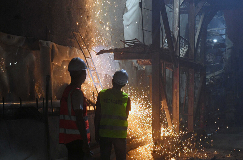4月20日,中铁二十二局集团第五工程公司建设者在曼么1号隧道焊接拱架