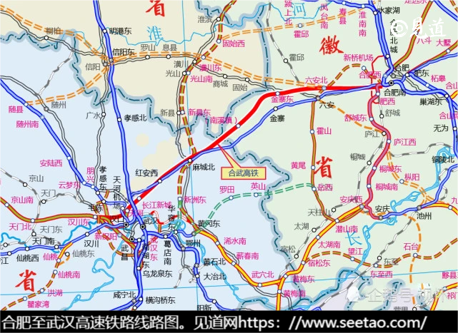 新建合肥至武汉高速铁路湖北段线路起自大别山隧道DK171+500,向西穿大别山脉,沿既有合武铁路南侧行至既有麻城北、红安站并站,后进入武汉市于黄陂区东南设长江新区站,出站后沿绕城高速西行至天河机场,于机场东南侧新设武汉天河站,出站后西两跨绕城高速公路于东西湖区新沟西线路所与武汉至宜昌高铁相衔接。本段新建正线长163.350km,设车站4座,分别是麻城北、红安、长江新区、武汉天河。