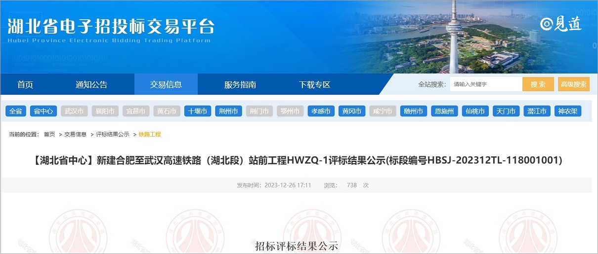 2023年12月26日,湖北省电子招投标交易平台发布了新建合肥至武汉高速铁路湖北段站前工程中标候选人公示,具体情况如下:
