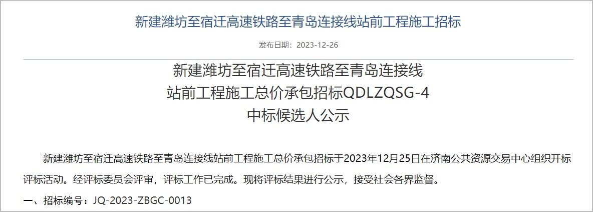 2023年12月26日,见道网记者从全国公共资源交易平台获悉,新建潍坊至宿迁高速铁路至青岛连接线站前工程施工总价承包招标中标候选人公示已发布。青岛至京沪高铁辅助通道铁路12月底将正式开工,将与项目主线潍宿高铁同步建成通车。