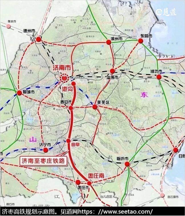 作为山东高铁网的重要组成部分,济枣高铁开工建设同样意义非凡。它是一条承担沿线城际及旅游客流为主的高速铁路项目,北起济南枢纽历城站,向南经泰安、济宁,止于枣庄市台儿庄区,全长约268.564公里。其中新建正线263.314公里,桥隧总长213.946公里,占线路长度的81.28%。全线新建桥梁62座,隧道18座,共设济南东、历城、南山、泰安东、宁阳东、曲阜东、邹城、滕州东、枣庄南、台儿庄10个车站,建成后与日兰高速铁路通道、石济客专、济青高铁、胶济客专、济滨高铁等相连,对于强化区域路网连通,加强日照、临沂、济宁、菏泽与省会济南的快速交流具有重要作用;对于促进区域旅游发展,支撑引领全省经济高质量发展具有重要意义。