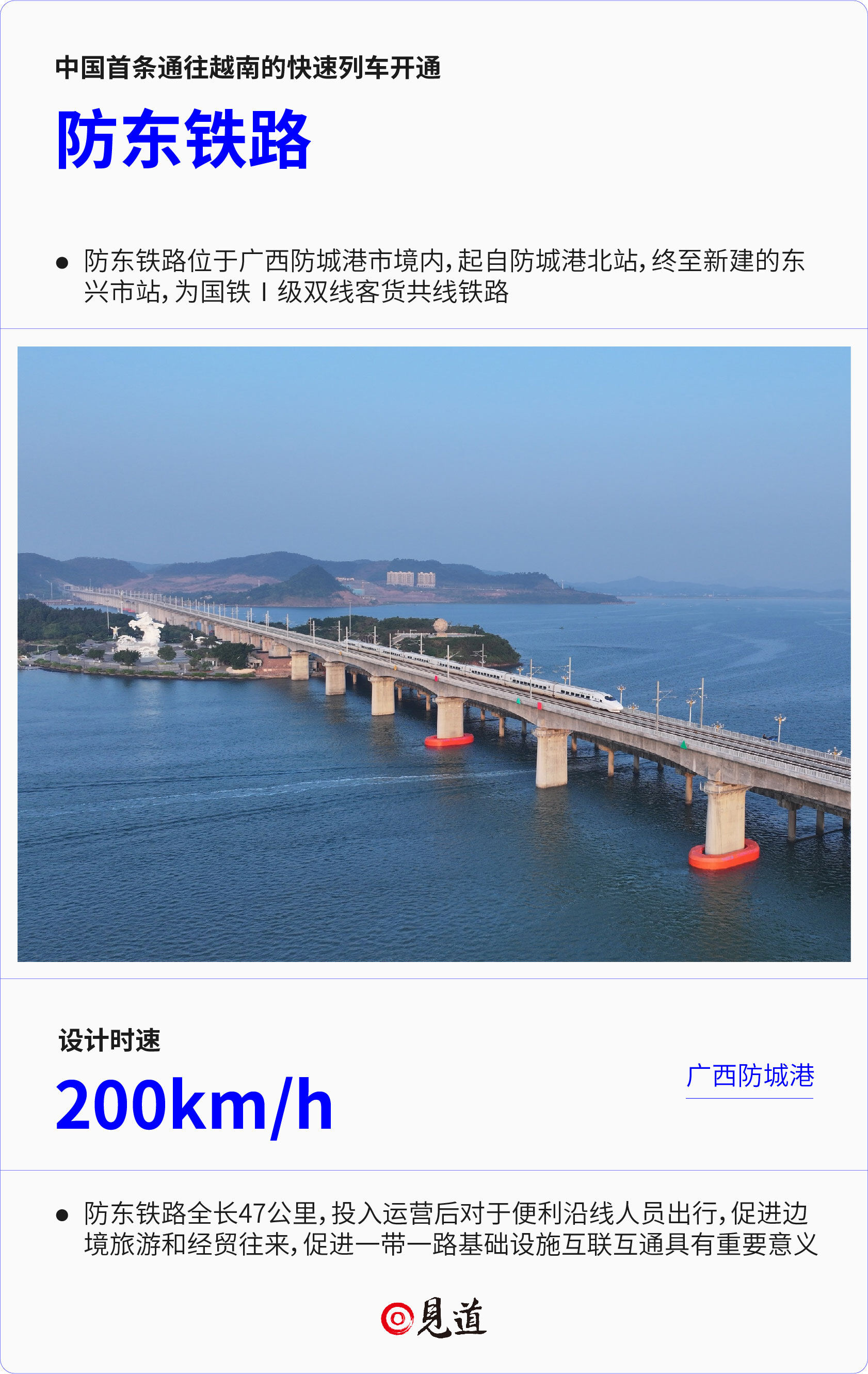 随着D8242次首发列车从位于中越边境的广西东兴市站开出,防东铁路正式开通运营,这是全国首条直通中越边境城市的高铁。口岸城市东兴也接入全国铁路网。