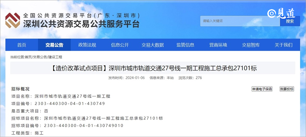 2024年1月6日,深圳市公共资源交易平台发布了深圳市城市轨道交通27号线一期工程施工总承包27101标招标公告,该项目所属行业轨道交通,项目总投资227.38亿元。