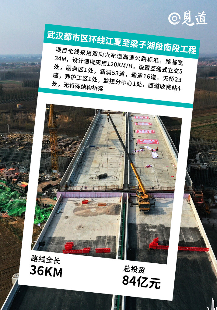 建设规模:武汉都市区环线江夏至梁子湖段南段工程,全线采用双向六车道高速公路标准,路基宽34m,设计速度采用120km/h,设置互通式立交5处,服务区1处,涵洞53道,通道16道,天桥23座,养护工区1处,监控分中心1处,匝道收费站4处,无特殊结构桥梁。路线起于江夏区山坡街道许家桥南侧,与武汉都市区环线汉南长江大桥及接线工程顺接,止于鄂州市梁子湖区太和镇以南设置太和南枢纽互通与鄂咸高速公路对接,路线全长约36km,总投资估算约84亿元。关键词:工程施工、工程建设资讯、工程新闻