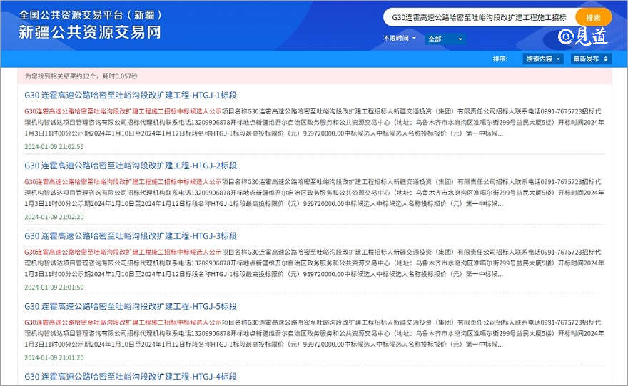 2024年1月9日,新疆公共资源交易网发布了G30连霍高速公路哈密至吐峪沟段改扩建工程中标候选人公示,本项目划分为12个标段建设,项目总投资204.38亿元。