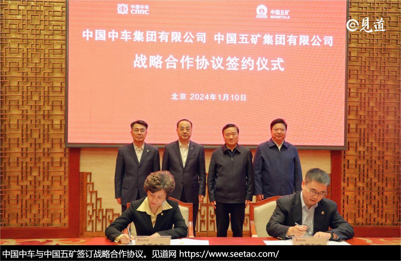 在2024年1月10日,中国中车和中国五矿携手签订了战略合作框架协议。中国中车党委书记、董事长孙永才和中国五矿党组书记、董事长翁祖亮进行了深入的交流,并共同见证了签约过程。中国中车党委副书记王铵和中国五矿党组副书记、总经理国文清也出席了签约仪式。最终,中国中车财务总监李铮和中国五矿副总经理朱可炳代表双方在协议书上签字,标志着双方的合作正式启动。