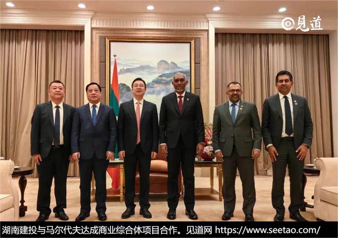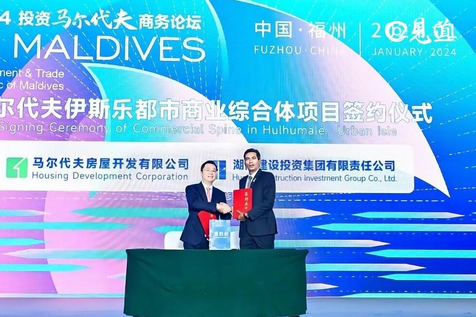 在2024年“投资马尔代夫”商务论坛上,湖南建投集团党委书记、董事长蔡典维与马尔代夫房屋开发有限公司签署了关于马尔代夫伊斯乐都市商业综合体项目的合作协议。