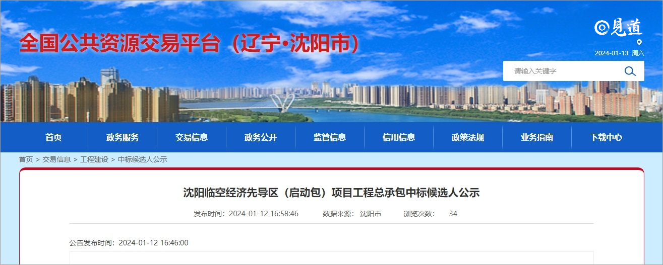 2024年1月12日,全国公共资源交易平台发布了沈阳临空经济先导区(启动包)项目工程总承包中标候选人公示,该项目由中铁上海工程局、中铁一局等6家单位中标。