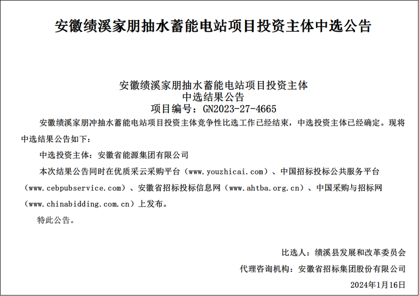 随着可再生能源的发展和电力体制的改革,抽水蓄能电站的应用场景也在不断扩展。2024年1月16日,安徽绩溪家朋抽水蓄能电站项目投资主体中选结果公告发布,安徽省能源集团有限公司成功中选该项目投资主体。