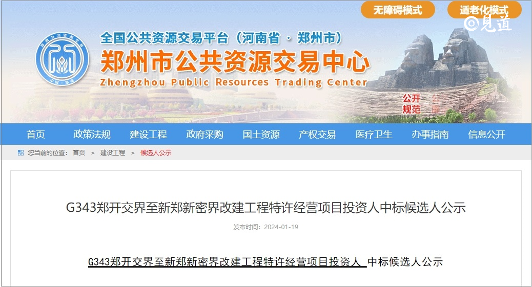 2024年1月19日,郑州市公共资源交易中心发布了G343郑开交界至新郑新密界改建工程特许经营项目投资人中标候选人公示,郑州路桥牵头的联合体中标,投标报价62.25亿元。