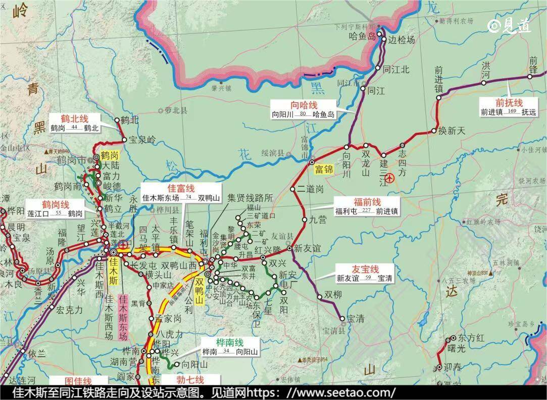 在车站设置方面,全线将利用既有车站15个,这些车站分别是东佳木斯、四马架、丰乐镇、笔架山、福利屯、金沙岗、升昌、红兴隆、新友谊、九营、二道岗、富锦、向阳川、同江、同江北站。同时,为了方便沿线乘客的出行,还将新建车站7个,包括利华、十三连、三十五连、漂筏河、致祥屯、石坊、赤卫。