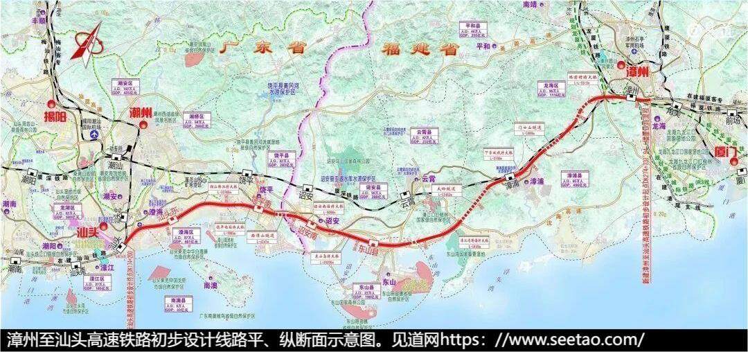 漳汕高铁,这条连接福建与广东的高铁线路,全长176.007公里,是中国东南沿海地区交通网络的重要组成部分。该线路从在建的福厦高铁漳州站引出,向西南方向穿越既有漳浦站,跨过漳江湾和诏安湾,最终接入在建的汕汕高铁汕头站。这样的线路设计使得漳汕高铁成为连接福建和广东两省的重要通道,为两地的经济交流和人员往来提供了更加便捷的交通方式。桥隧比高达88.31%,共设漳州、漳浦、东山县、诏安南、饶平南、汕头东站(预留)、汕头等7座车站。其中,漳州、漳浦、汕头为既有车站,东山县、诏安南、饶平南为新建车站。