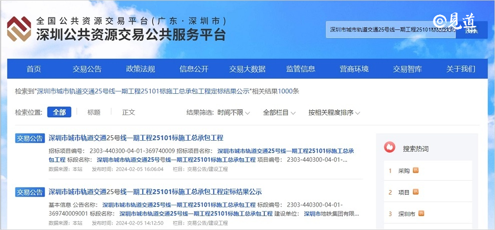 2024年2月5日,深圳市公共资源交易平台发布了深圳市城市轨道交通25号线一期工程25101标施工总承包工程定标结果公示,该项目由中建四局、中建安装集团等9家单位中标,计划总投资178.4亿元。