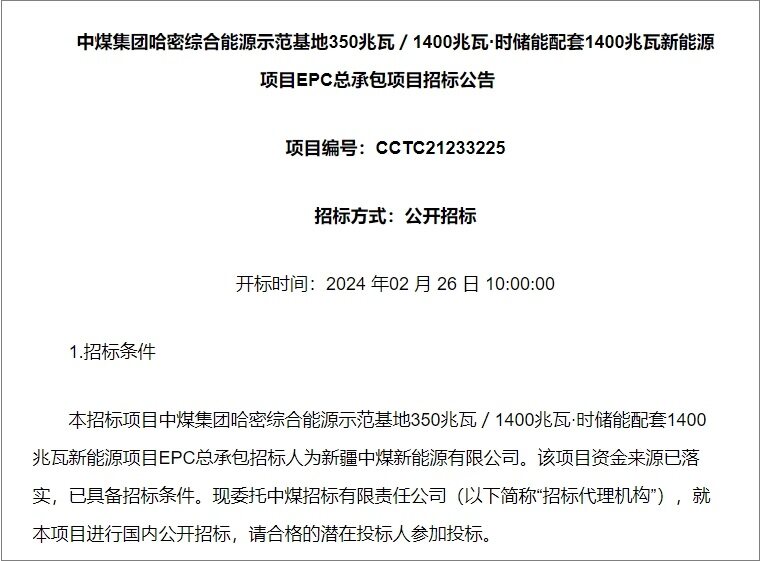 随着全球范围内对可再生能源需求的持续上升,新能源项目如风电和太阳能等正逐步成为能源领域的发展重心。近日,新疆中煤新能源有限公司发布中煤集团哈密综合能源示范基地350兆瓦/1400兆瓦时储能配套1400兆瓦新能源项目EPC总承包项目招标公告,详情如下: