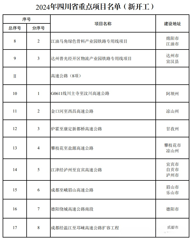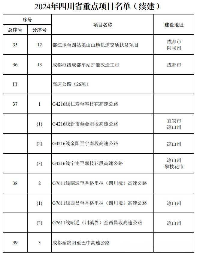 从建设时间来看,2024年全省重点项目继续保持滚动接续态势。新开工项目196个,包括金口河至西昌高速公路、丹巴水电站、泸州老窖智能酿造技改等项目。续建项目504个,包括隆黄铁路隆昌至叙永段扩能改造工程、绵阳高新区巨星永磁、双江口水电站等项目。