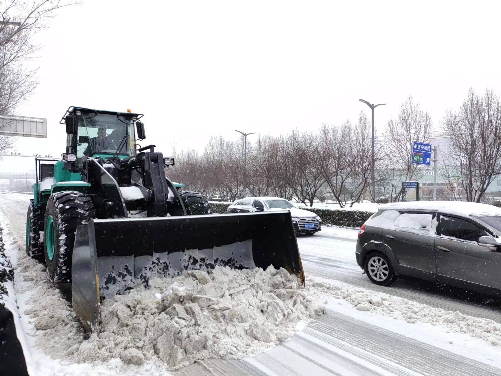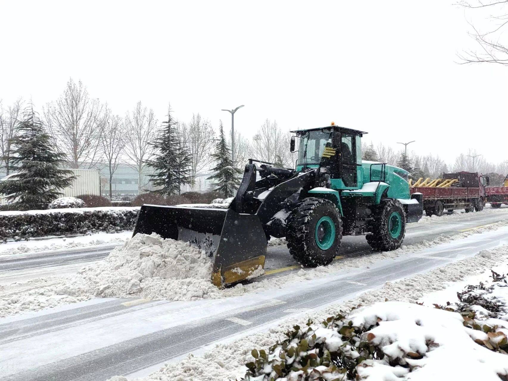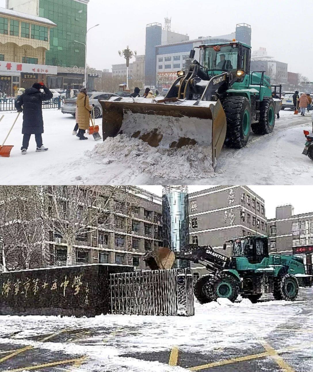 为解决市民的出行问题,山推勇担重任,紧急安排十余台纯电装载机,对任城区古槐路、十五中校区,高新区崇文大道、德源路、济微高速路口等主干道开展扫雪除冰作业,将路面的积雪清理得干干净净。