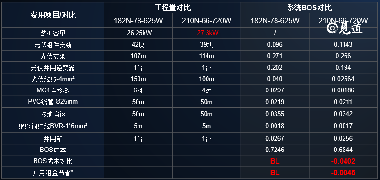 在户用分布式场景下,以河南郑州某户用屋顶测算项目为例,与182N-625W组件相比,至尊N型720W组件在同一户用屋顶装机量提升4%,BOS成本节省约4.02分/W,在新一代超高功率组件中系统价值全面胜出。