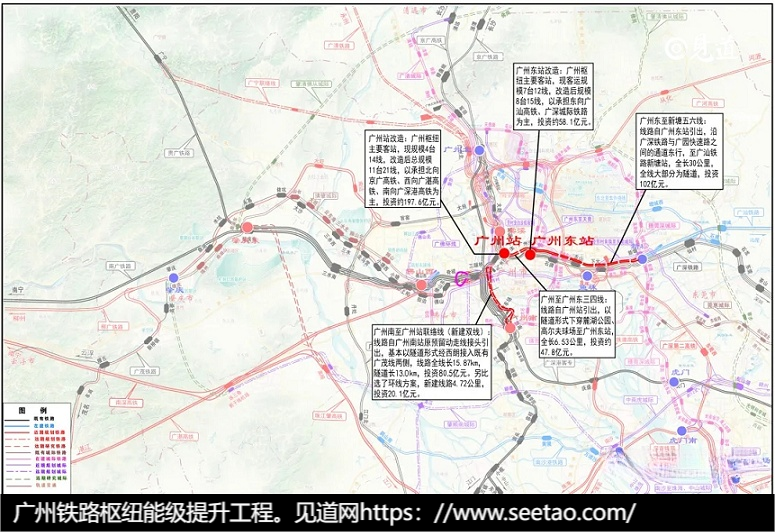广州东站将按照地面+地下贯通车场双层车场方案改建,改造后广州东站升级为高铁站。总规模为14台24线,其中地面场设8台14线,地下场设6台10线。