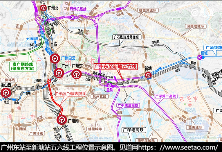 新建广州铁路枢纽广州东站至新塘站五六线工程位于广州市天河区、黄埔区、增城区境内,西起广州东站,东至新塘站,与既有广深铁路并行。是广汕高铁引入广州市区的重要项目。