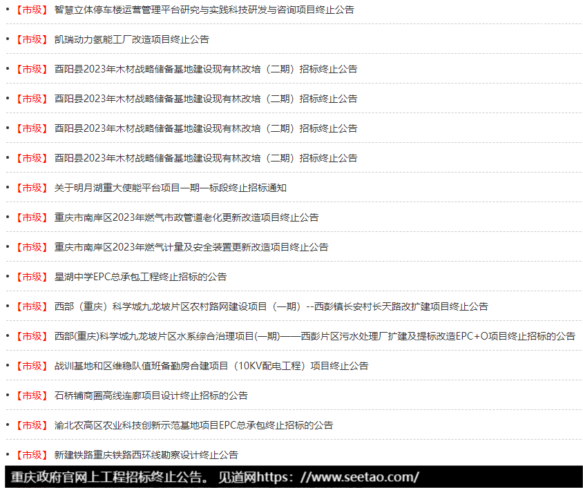 以重庆为例,截至2024年3月4日,政府官网上已经有超过16条工程招标终止公告,数量远超往年。