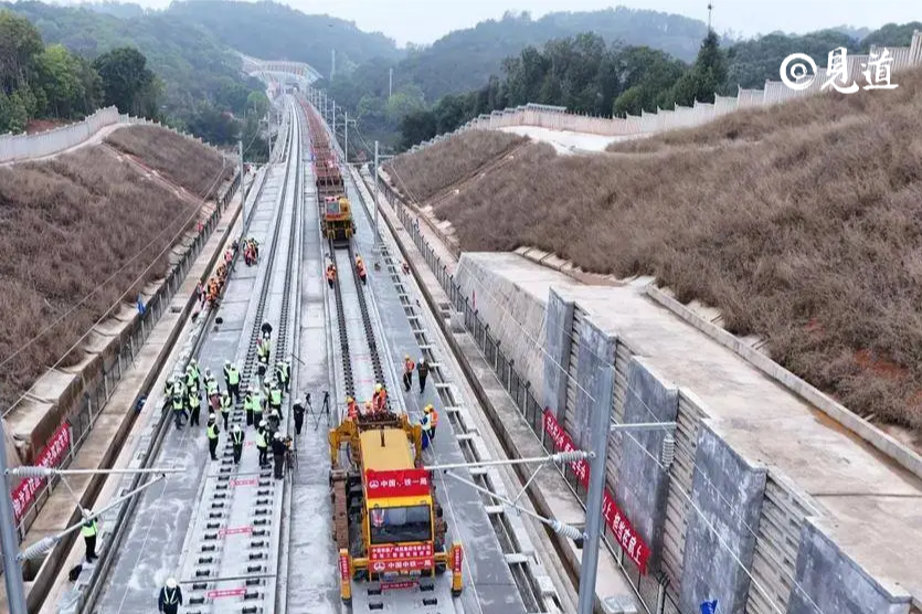 2024年3月17日,广东省河源市龙川县,新建梅州至龙川铁路栗子坑大桥施工现场洋溢着热烈而庄重的氛围。随着机器的轰鸣,一台新型多功能牵引车缓缓驶来,稳稳地将一对长达500米的钢轨铺设在无砟道床上,标志着苏区梅州融入粤港澳大湾区的重大基础设施项目——梅龙高铁,正式迈进全线铺轨的新征程。