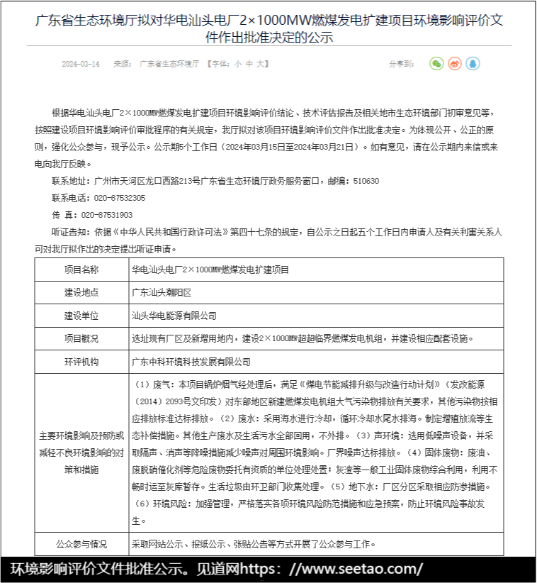 广东省生态环境厅近期公示了关于华电汕头电厂2×1000MW燃煤发电扩建项目环境影响评价文件的批准意向。根据公示内容,该项目计划选址于现有厂区及其新增用地范围内,将建设2台1000MW的超超临界燃煤发电机组,并配备相应的辅助设施,以确保项目的顺利运行和环保达标。