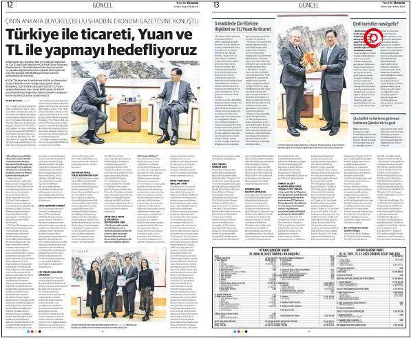 2024年3月25日,土耳其主流经济媒体《经济报》刊登了对刘少宾大使的专访内容。在此次专访中,刘大使针对中国两会的重要议题、中国经济的持续发展态势以及中土两国在经贸领域的深入合作等核心话题,详尽地回答了《经济报》安卡拉首代马鲁夫所提出的问题。