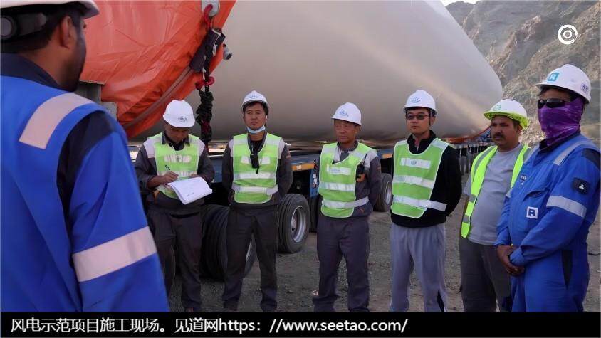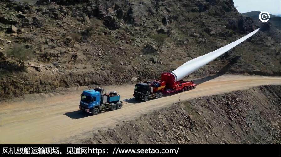 另一边,几百公里外的AL HALAH现场,其运输条件则完全是一种不同的情形了。那里是山地地貌,运输道路狭窄且陡峭,几十米长叶片,要走过一条将近45度倾斜、15公里长的山路,难度不言而喻。在对地貌路况进行多轮实地考察后,项目团队敲定了道路整改的方法,通过山土移除、电线杆拆除及电线埋设等一系列措施,实现叶片、塔筒及发电机等大型货物的安全运输。