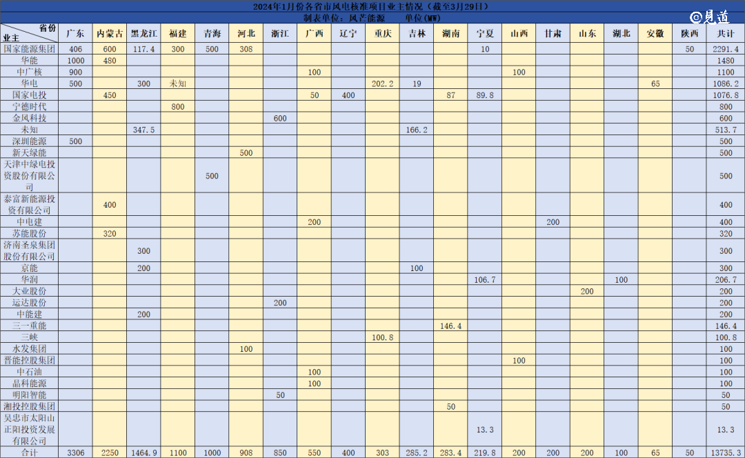 具体来看,广东省在2024年一季度批复的风电项目中,华能集团表现突出,核准项目容量最多,达到1GW。中广核集团和华电集团、深圳能源也均有不俗表现,核准容量分别为900MW和500MW。这些企业在广东省的风电产业布局不仅有助于推动当地清洁能源的发展,也为全国风电产业的快速发展贡献了力量。