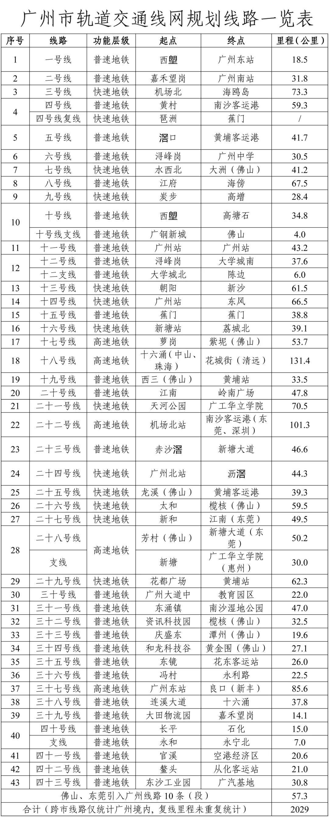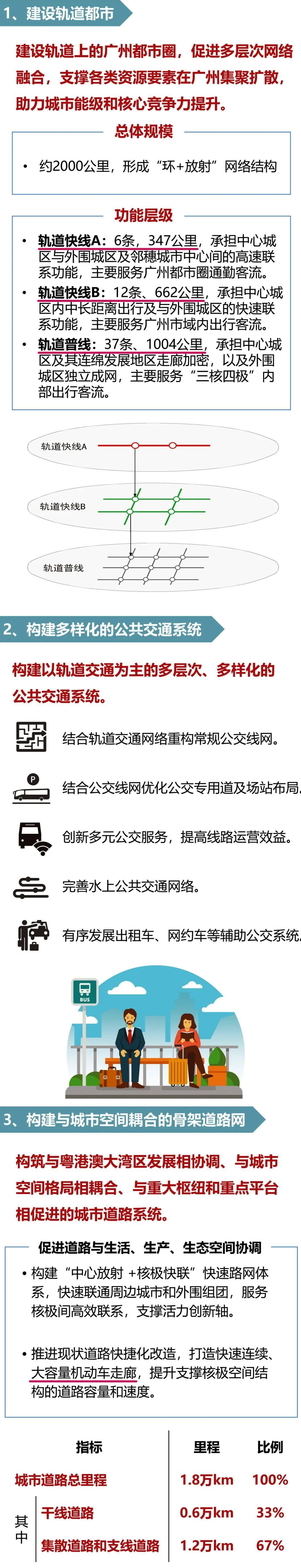 超过1000公里的18条轨道快线(160时速+120时速),支撑广州中心城区和外围城区的高速联系,以及广州通往佛山、东莞的通勤客流。