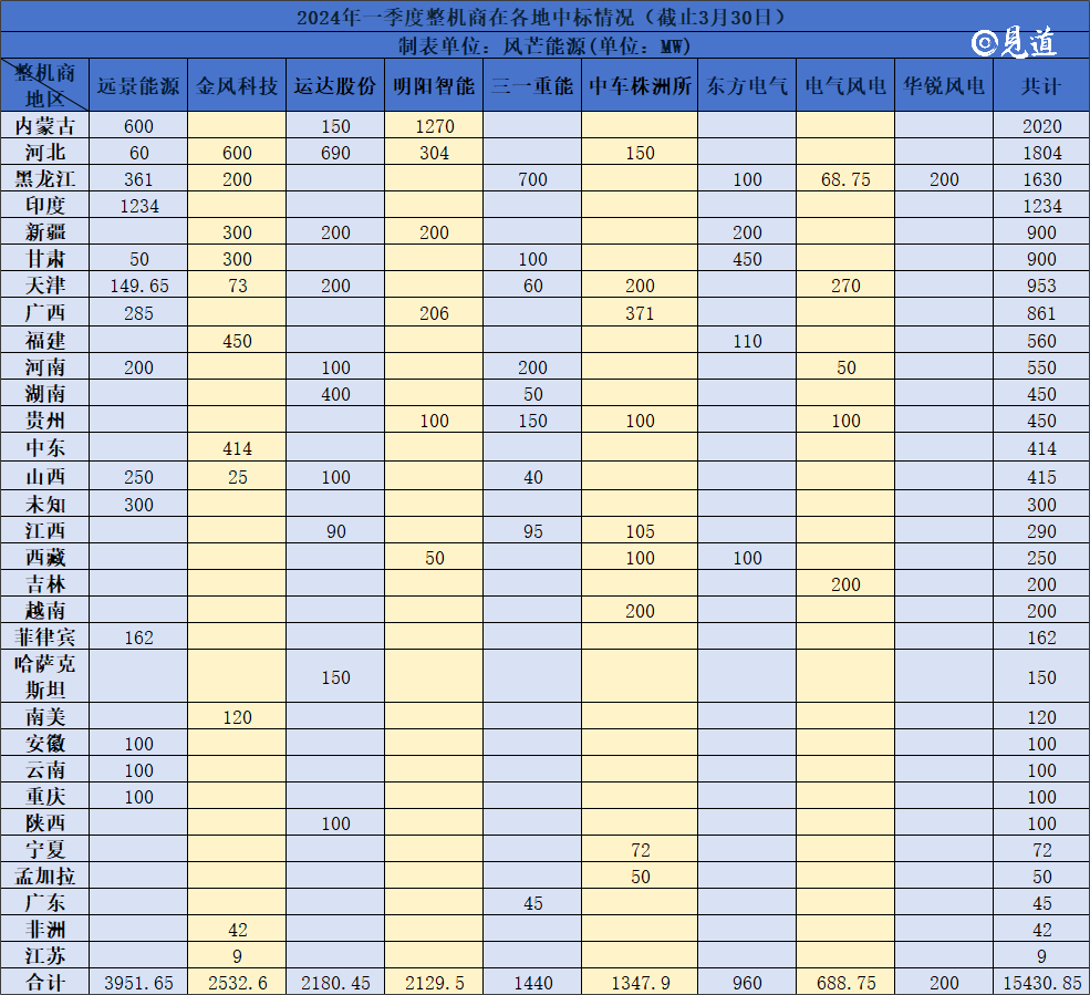 从省份角度来看,内蒙古市场依然活跃。一季度,内蒙古地区累计完成风机中标2.02GW,成为全国风电市场的重要力量。明阳智能、远景能源、运达股份等企业在内蒙古地区均有不俗表现,为当地风电产业的发展做出了积极贡献。