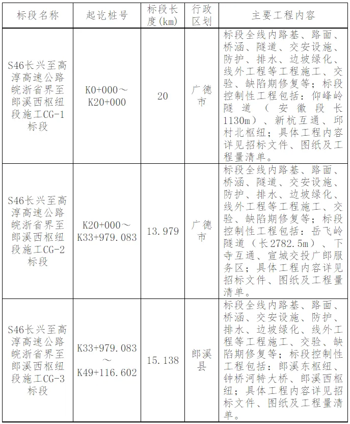 标段划分:本次招标范围为一期工程,即起点皖浙界至郎溪西枢纽段。本次施工招标划分为3个标段: