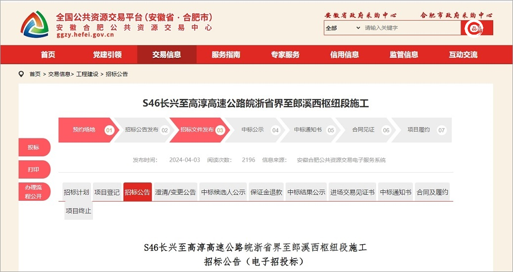 2024年4月5日,及见到记者从合肥公共资源交易中心了解到,S46长兴至高淳高速公路皖浙省界至郎溪西枢纽段施工招标公告已发布,该项目所属行业公路工程,项目总投资59.8亿元。