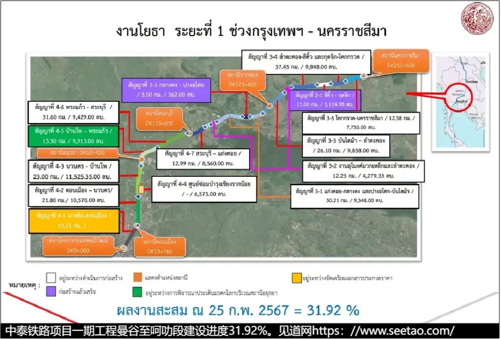 2024年4月7日,泰国交通部长素利亚公布了中泰铁路项目一期工程曼谷至呵叻段的最新进展。该项目全长250.77公里,预计投资高达1,794.1221亿泰铢。根据最新数据,截至2024年2月25日,一期工程的建设进度已达到31.92%。