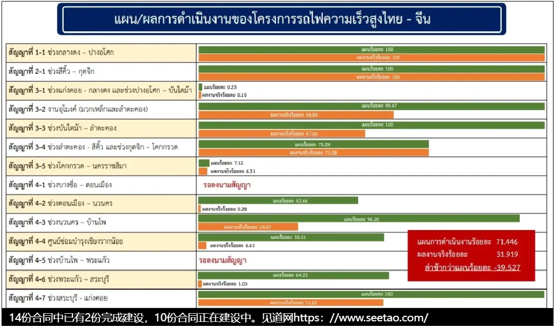 中泰铁路项目一期工程的土建工程涵盖了14份合同,自2017年12月21日启动以来,一直朝着2028年竣工通车的目标努力。然而,原计划中的建设进度应为71.44%,但现实情况显示,土建工程的实际进度相较于预期落后了39.52%。对此,泰国交通部已经指示国家铁路局加大推进力度,确保工程不再受到进一步的延误。同时,为了更有效地解决可能出现的问题,交通部特别指派铁路运输厅作为主导机构,负责监督铁路局的建设工作,确保其严格遵循既定规划进行。