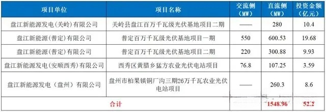 盘江股份计划通过其控股子公司盘江新能源发电关岭有限公司,投资建设关岭县盘江百万千瓦级光伏基地二期项目,该项目将安装容量达到280MWp的光伏设备,预计总投资为10.4亿元;盘江股份的全资子公司盘江新能源普定有限公司将负责普定百万千瓦级光伏基地项目一期和二期的投资建设,这两个项目的总额定装机容量为770MW,实际建设安装容量将达到901.41MWp,预计总投资额为29.61亿元;盘江股份的全资子公司盘江新能源发电安顺、西秀有限公司也参与西秀区黄腊乡猛方农业光伏电站项目的投资建设,该项目的额定装机容量为76.8MW,实际建设安装容量为107.25MWp,预计总投资为3.59亿元;盘州有限公司作为盘江股份的全资子公司,将负责盘州市柏果镇铜厂沟三期26万千瓦农业光伏电站项目的投资建设,该项目的建设安装容量为260.3MWp,预计总投资为8.6亿元。