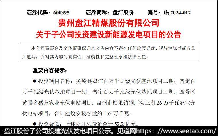 2024年4月9日,贵州省盘江股份宣布其子公司将投资新能源发电项目。为响应国家双碳政策与贵州能源集团组建战略,盘江股份计划通过旗下4家子公司,投资约52.2亿元建设总装机容量为155万千瓦的光伏电站项目,以加速清洁能源布局。
