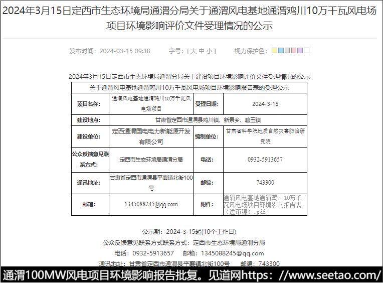 2024年4月8日,国电电力甘肃新能源在定西市通渭县的风电项目获得了定西市生态环境局通渭分局的《关于通渭风电基地通渭鸡川10万千瓦风电场项目环境影响报告表的批复》文件。这一批复标志着该风电项目已顺利完成环境影响评估备案程序,为后续依法合规建设奠定了坚实的基础。