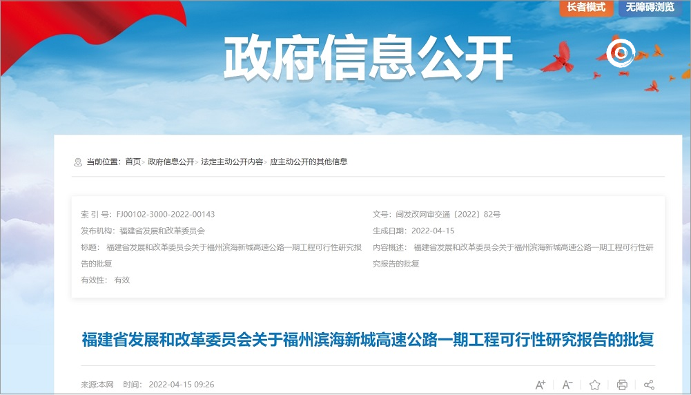 调整福州滨海新城高速公路一期工程可行性研究报告获批