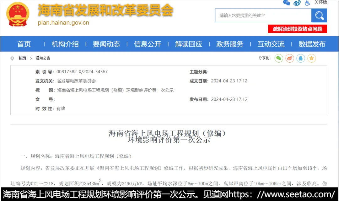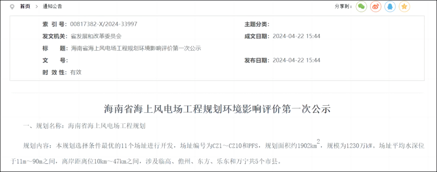 2024年4月23日,海南省发展和改革委员会正式公布了《海南省海上风电场工程规划(修编)环境影响评价第一次公示》。这一公示的发布,旨在就海南省海上风电场工程的规划修编进行环境影响评价,广泛征求公众意见,确保项目在推进过程中充分考虑环境因素,实现可持续发展。