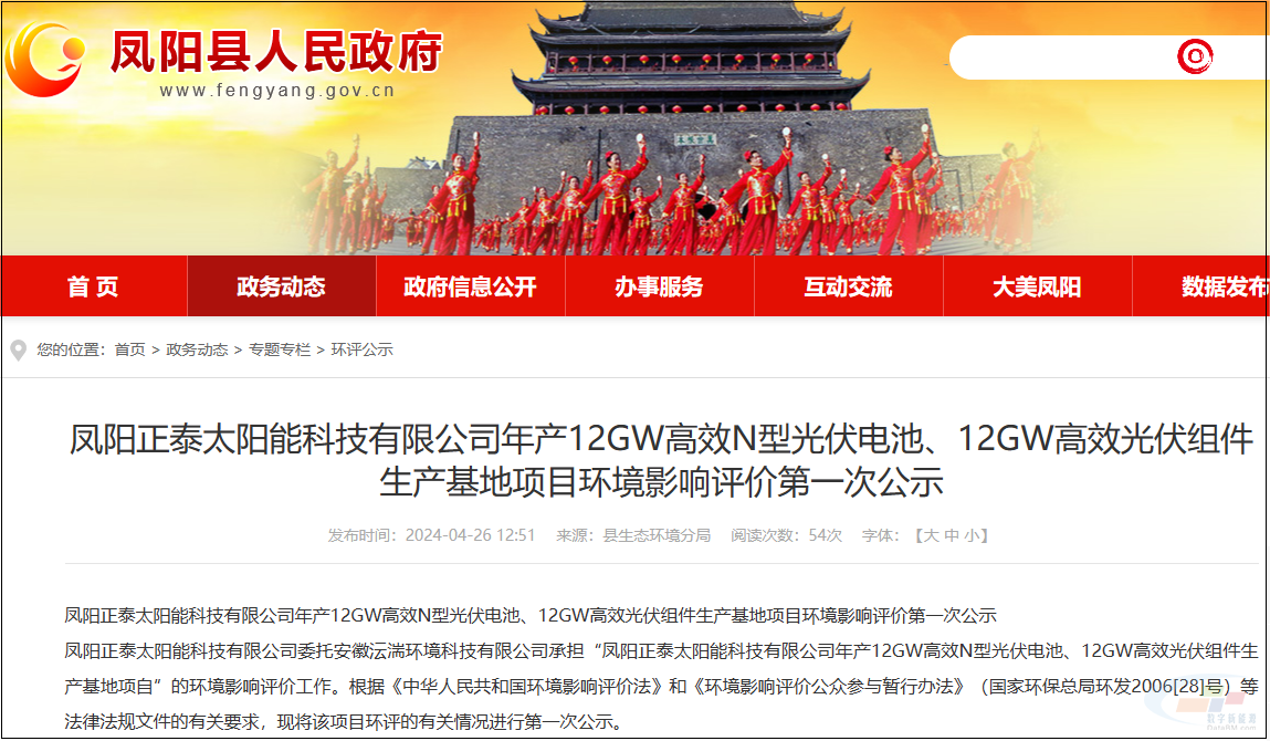 2024年4月26日,安徽凤阳县人民政府发布了《凤阳正泰太阳能科技有限公司年产12GW高效N型光伏电池、12GW光伏组件生产基地项目环境影响评价第一次公示》。该项目的成功落地,将带动相关产业链的发展,促进当地经济的增长和就业的提升,为凤阳县乃至整个安徽省的新能源产业发展注入新的活力。
