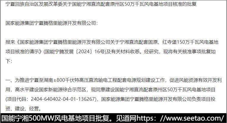 2024年5月9日据悉,宁夏回族自治区发展改革委正式批复国能宁湘直流配套原州区50万千瓦风电基地项目。批复文件明确,国能宁湘直流配套原州区50万千瓦风电基地项目将由国家能源集团宁夏腾格里能源开发有限公司全权负责其投资、建设及运营工作。