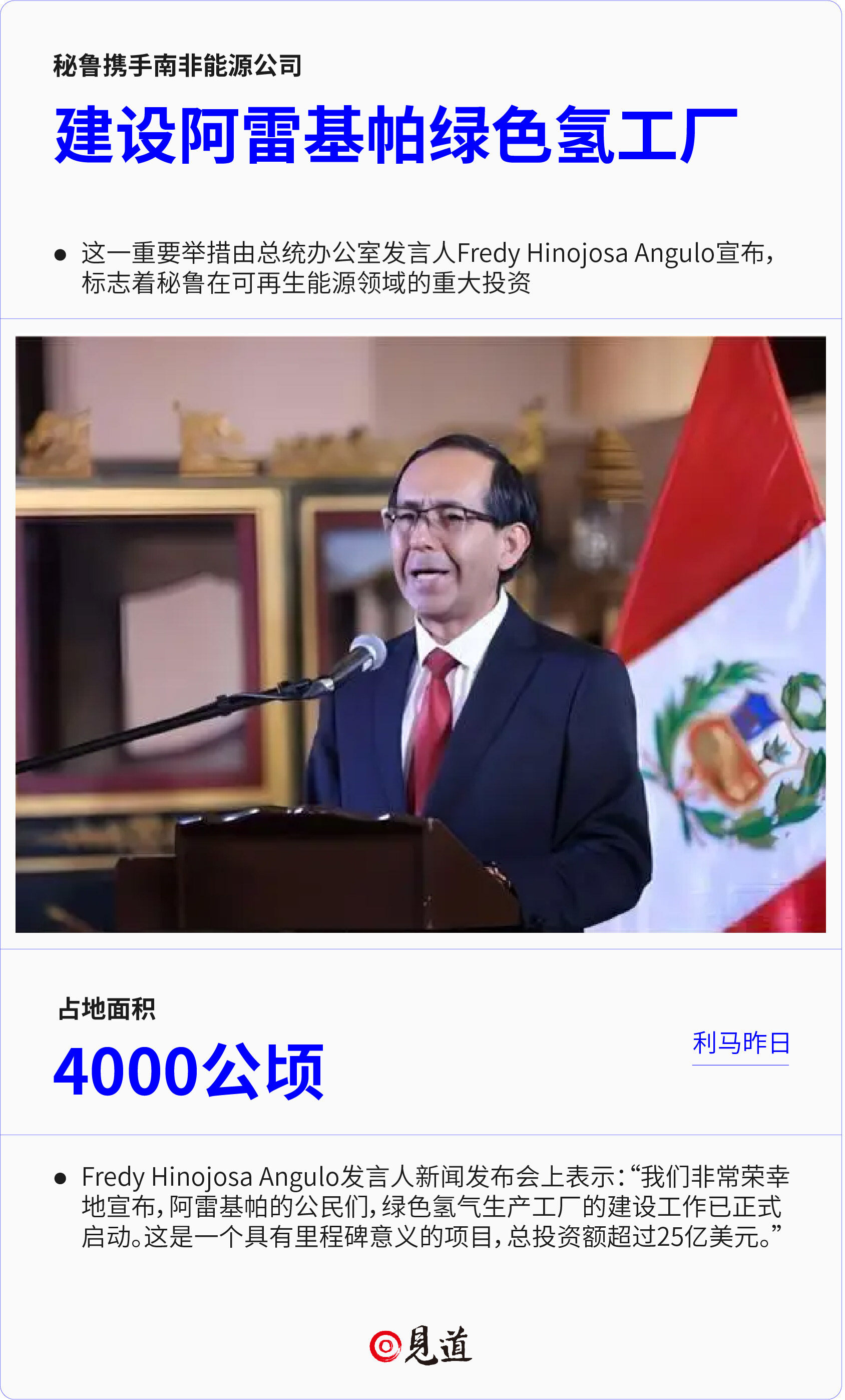 Fredy Hinojosa Angulo发言人在利马昨日举行的新闻发布会上表示:“我们非常荣幸地宣布,阿雷基帕的公民们,绿色氢气生产工厂的建设工作已正式启动。这是一个具有里程碑意义的项目,总投资额超过25亿美元。”