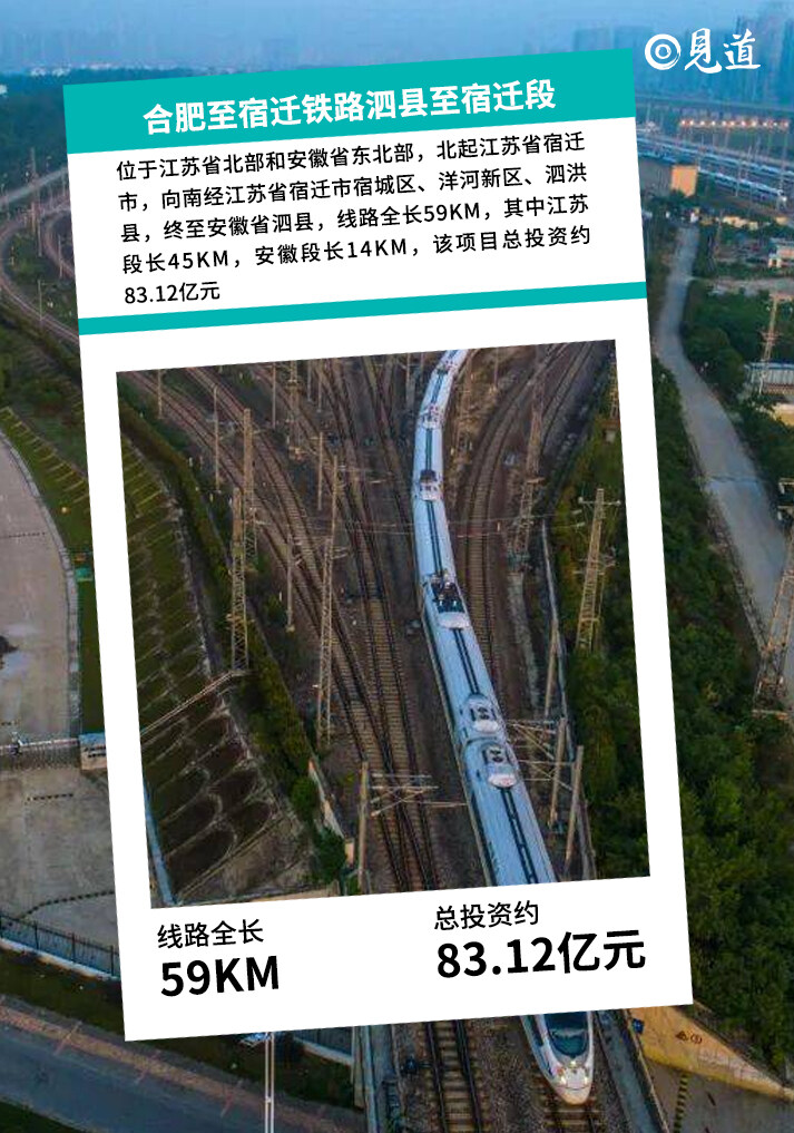 合肥至宿迁铁路泗县至宿迁段位于江苏省北部和安徽省东北部,北起江苏省宿迁市,向南经江苏省宿迁市宿城区、洋河新区、泗洪县,终至安徽省泗县,线路全长59km,其中江苏段长45km,安徽段长14km,该项目总投资约83.12亿元。