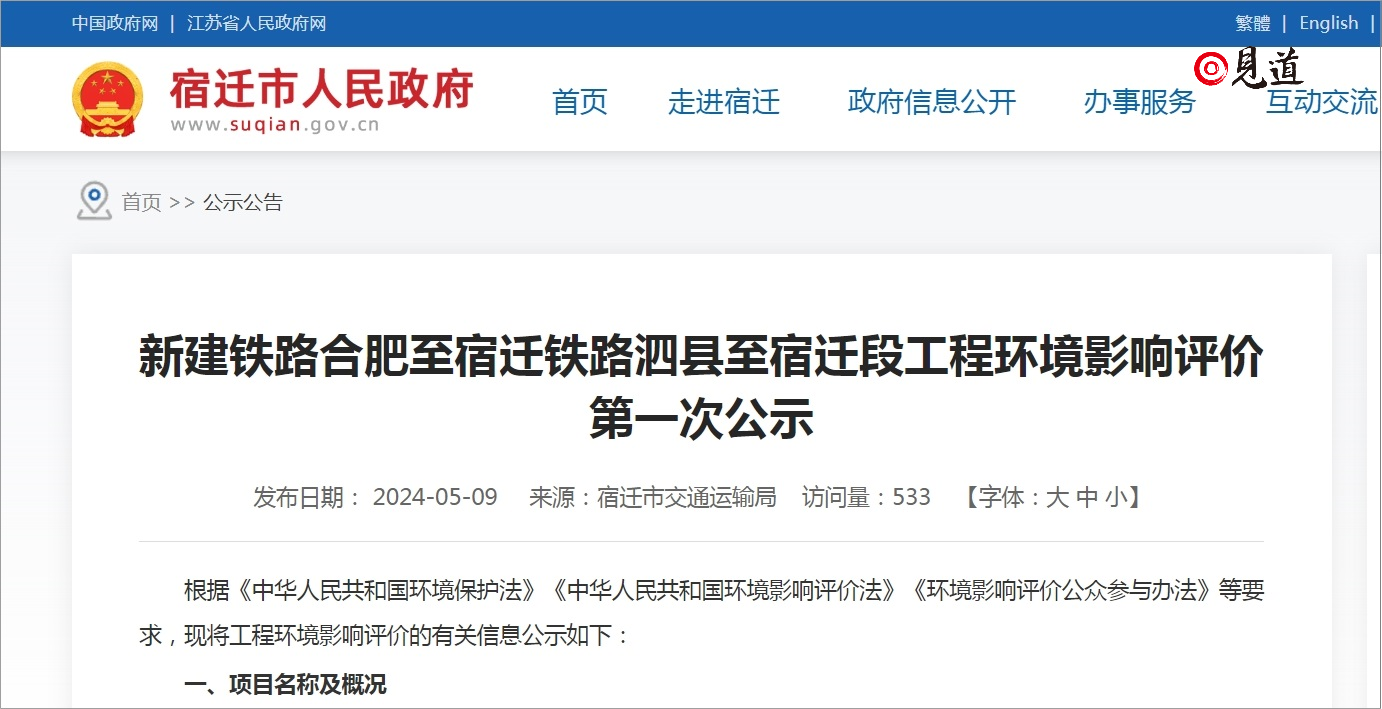2024年5月9日,见道网记者从宿迁市、泗县人民政府网获悉,新建合肥至宿迁铁路泗县至宿迁段项目环境影响评价首度公示已发布,该项目已正式列入国家2024年铁路开工计划,初步设计批复及前期工作正同步加速推进。