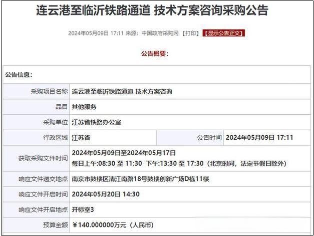 江苏省铁路办于2024年5月9日正式发布了关于连云港至临沂铁路通道以及徐州至菏泽铁路通道的技术方案咨询采购公告,标志着这两大铁路通道的方案研究前期工作即将拉开帷幕。