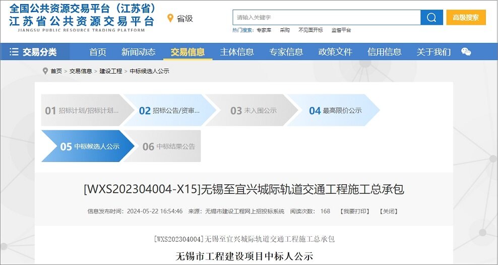 2024年5月22日,江苏省公共资源交易平台发布了无锡至宜兴城际轨道交通工程施工总承包目中标人公示,这一项目的合同估算价高达206.8元,详情如下: