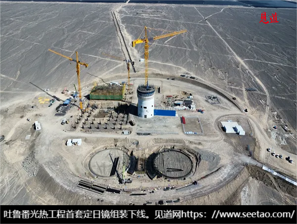 目前,项目施工正按计划稳步推进。吸热塔的关键部分已经开始浇筑,定日镜的放桩工作也取得了显著进展。主厂房和厂前区的建设同样如火如荼,各项基础工程已顺利完成,为后续的施工奠定了坚实基础。