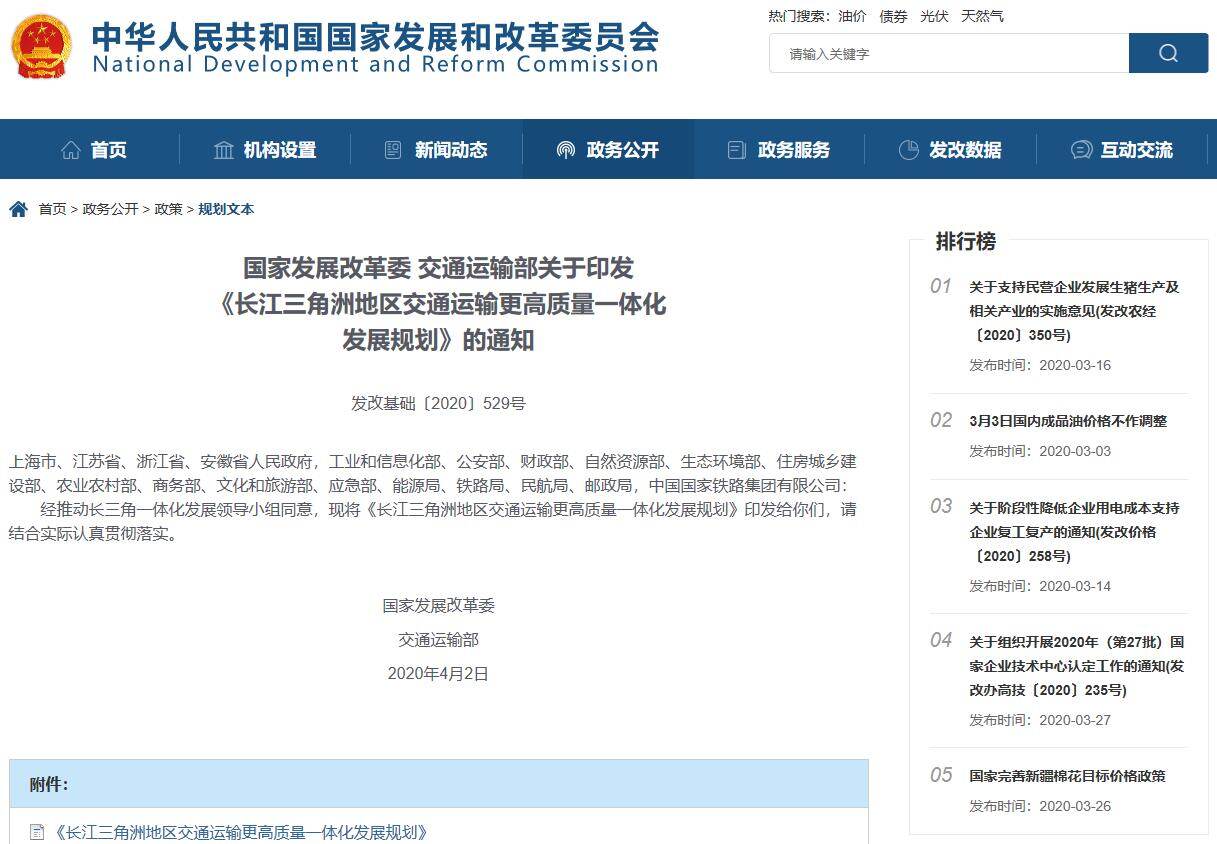 2020年4月27日,国家发改委网站公布关于印发《长江三角洲地区交通运输更高质量一体化发展规划》的通知。经推动长三角一体化发展领导小组同意,国家发展改革委和交通运输部正式印发《长江三角洲地区交通运输更高质量一体化发展规划》。