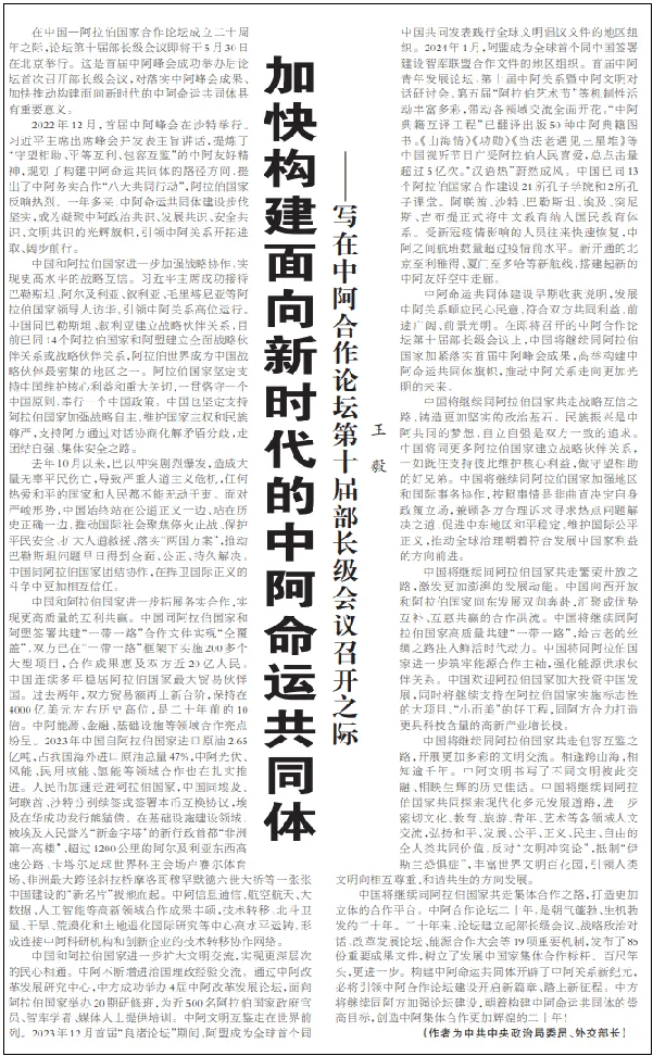 在中国—阿拉伯国家合作论坛成立二十周年之际,论坛第十届部长级会议即将于5月30日在北京举行。这是首届中阿峰会成功举办后论坛首次召开部长级会议,对落实中阿峰会成果、加快推动构建面向新时代的中阿命运共同体具有重要意义。